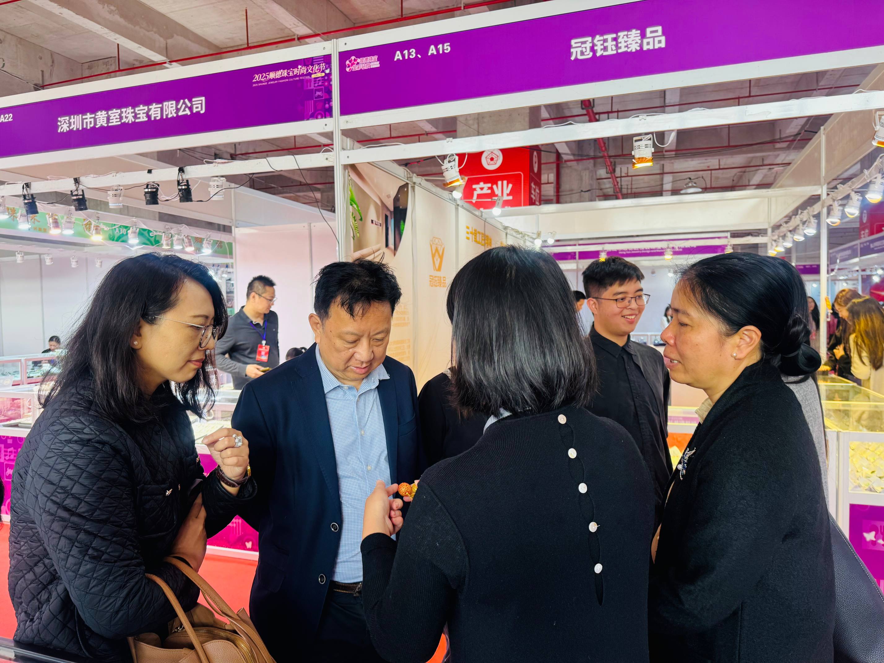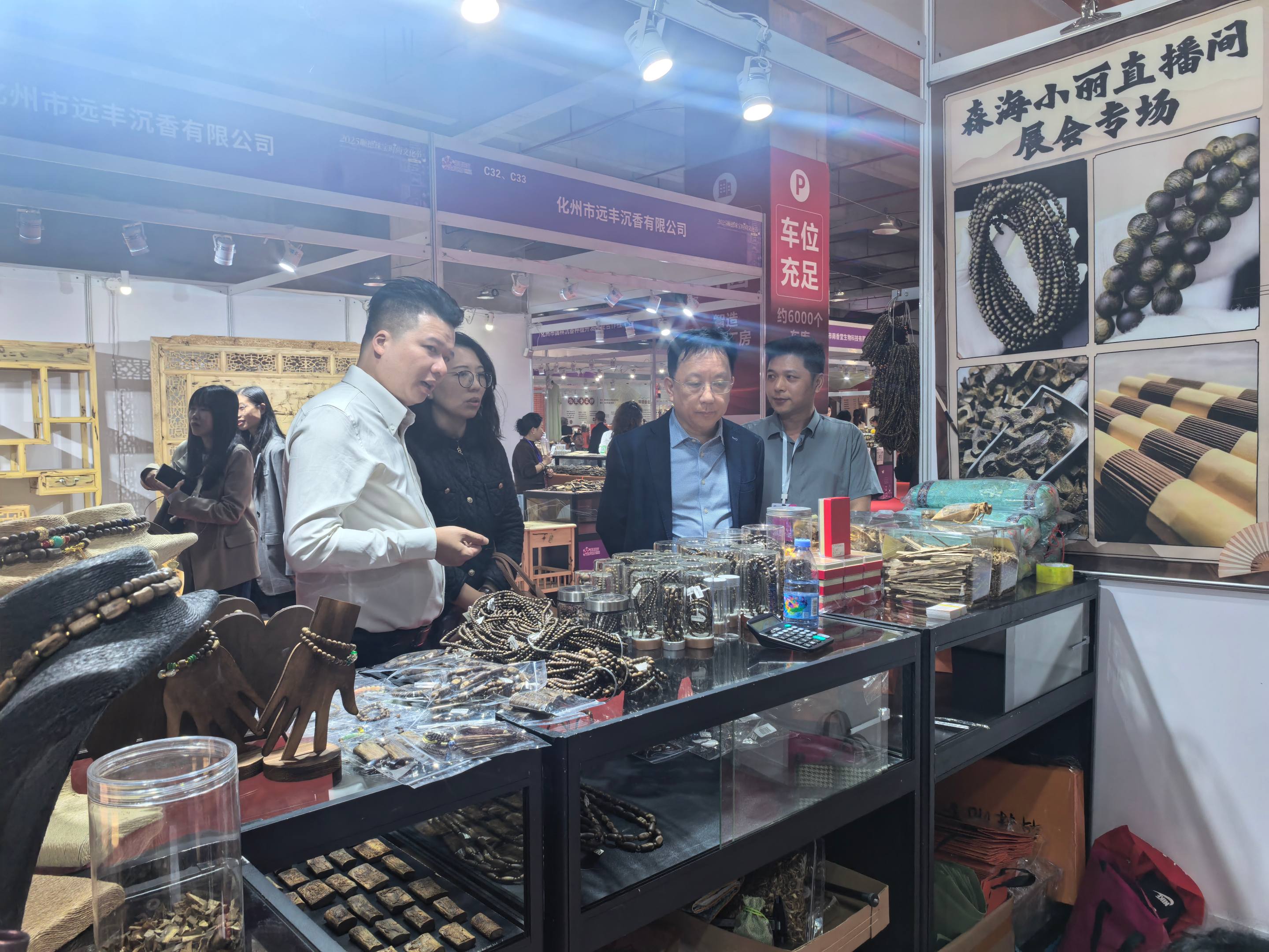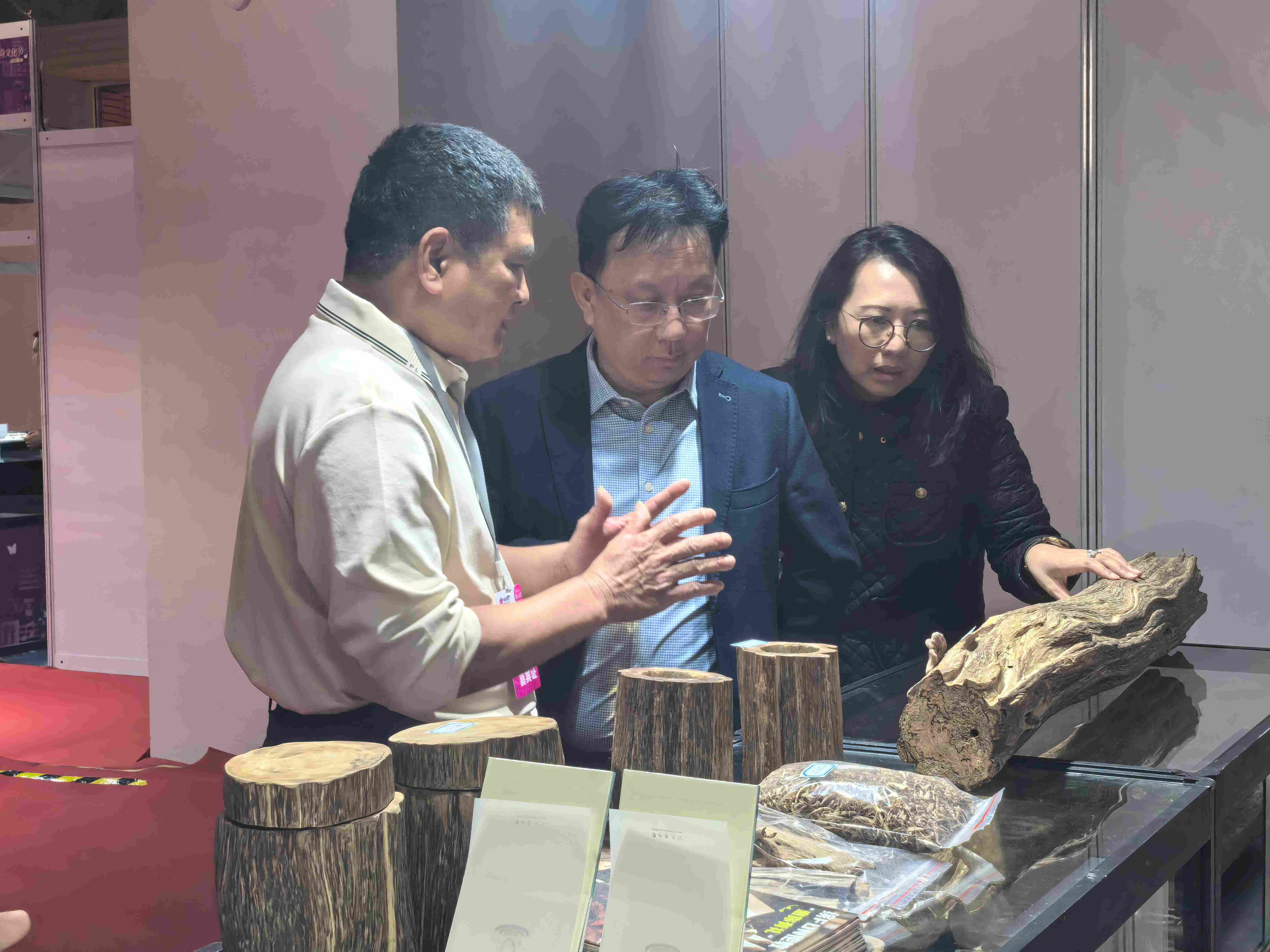 展会期间,会长黄建民和秘书长简海琪逐一走访多家参展企业,深入交流发展动态,并与沉香协会探讨跨界合作,推动珠宝与沉香等元素创新融合,拓展产品内涵与市场边界。