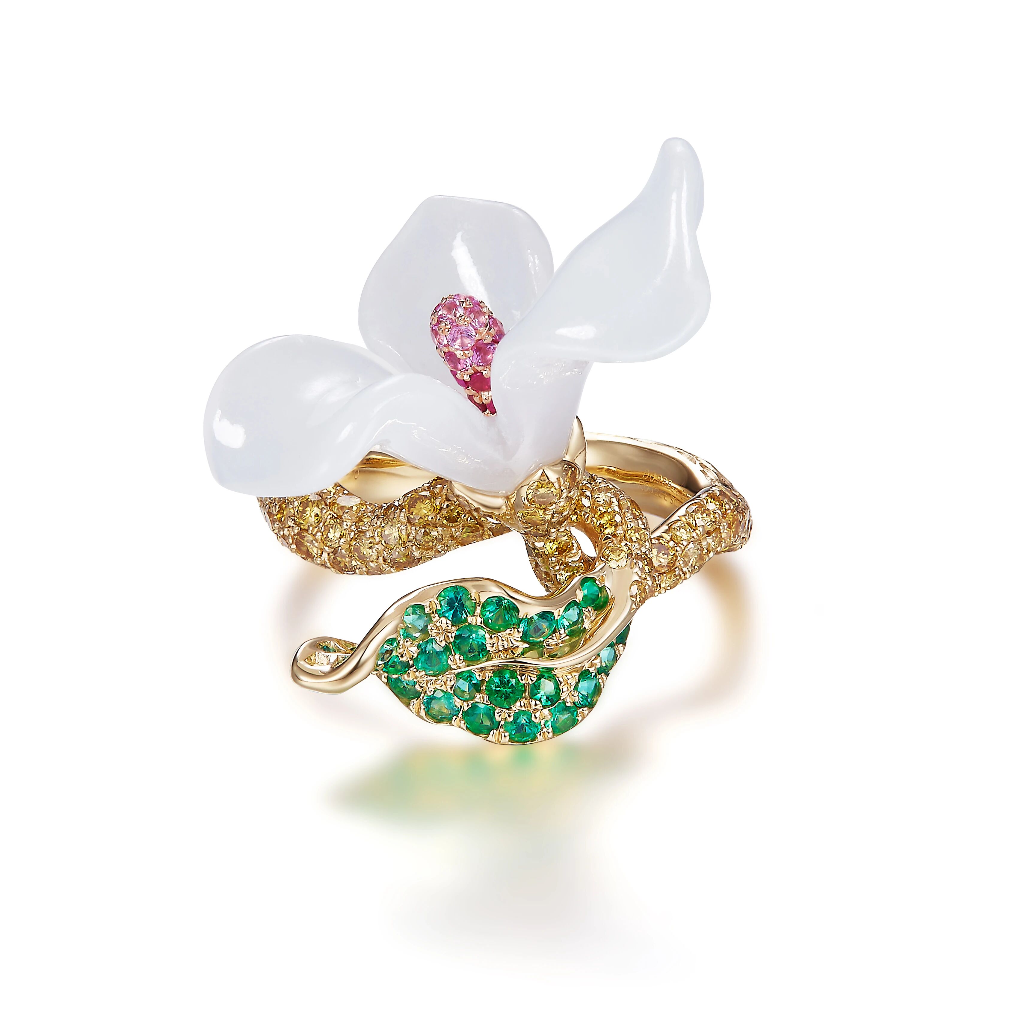 选自半开玉兰的造型,花瓣微张的质感与动态,以渐变彩宝、灵动蜜蜂与翡翠组合,提升了整件作品的视觉丰盈感和高级感,展现了玉兰花刚与柔的融洽。