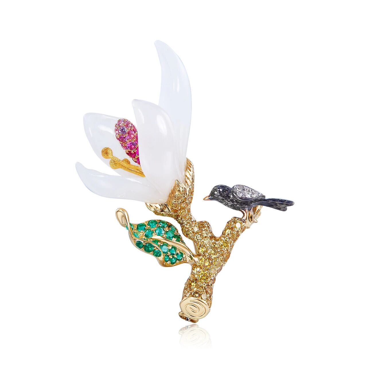 在工艺创新与风格打造上,公司不断突破:采用一级白籽料精雕细琢的白玉兰花,花瓣晶莹剔透,一尘不染中透露着淡雅高贵,以绚丽多彩的天然彩宝来点缀花蕊和绿叶。