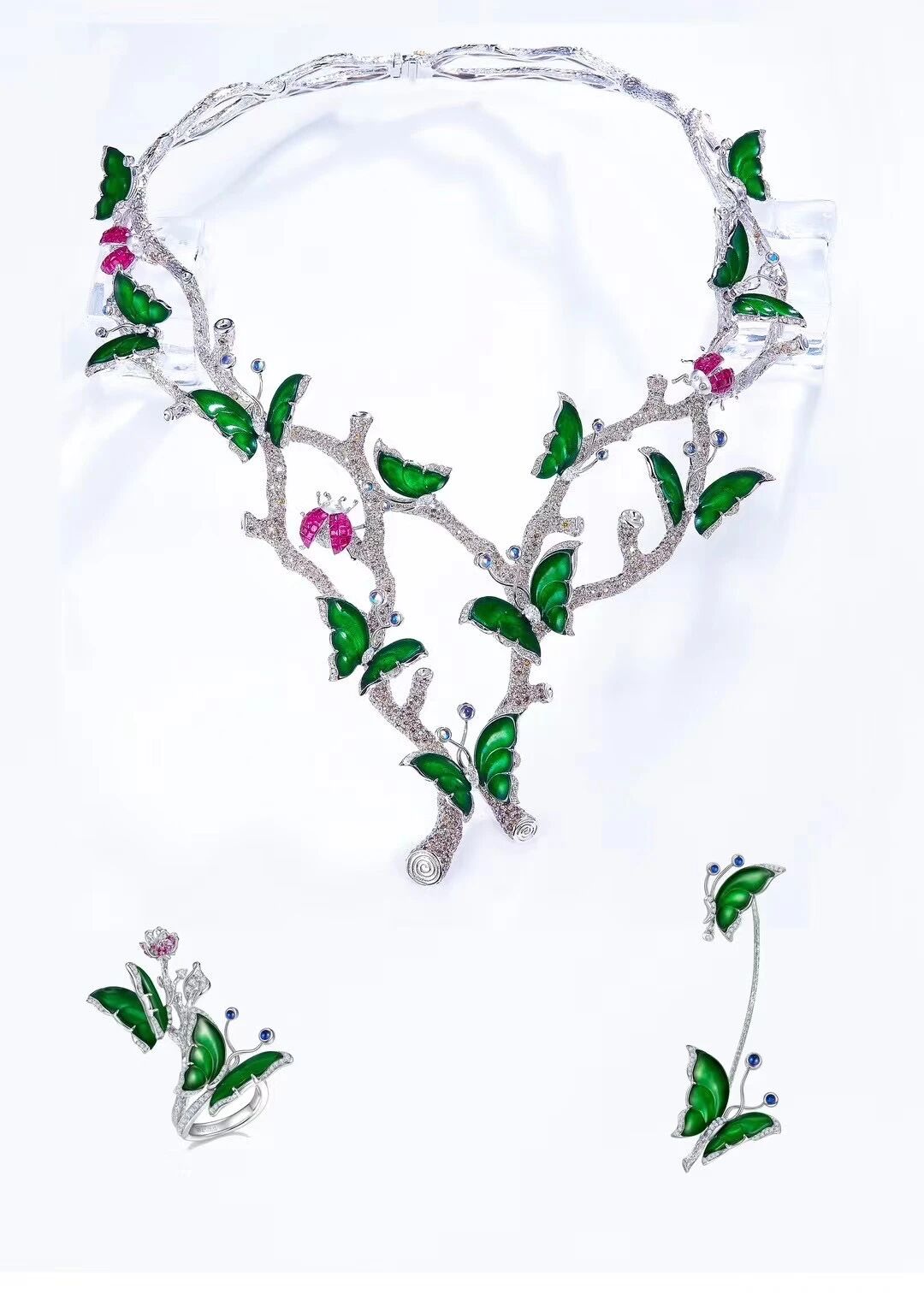 这个系列从自然萃取灵感,捕捉植物自然生长的姿态,以超高的工艺描摹出恣意舒展的树枝形态,电镀分色刻画出藤绕树干的曼妙与真实。满绿翡翠蝴蝶停驻于盛开的枝叶之间。隐秘式镶嵌工艺的宝石瓢虫,冷暖搭配,美而梦幻。