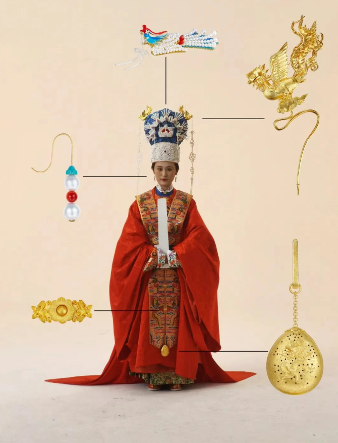该冠饰以《临淮侯夫人史氏像》为蓝本复原,耗用6900余颗淡水珍珠,融合雕蜡、点翠、手工绣、钉珠等多项传统技法,历经近百天的潜心研究与精心制作而成。