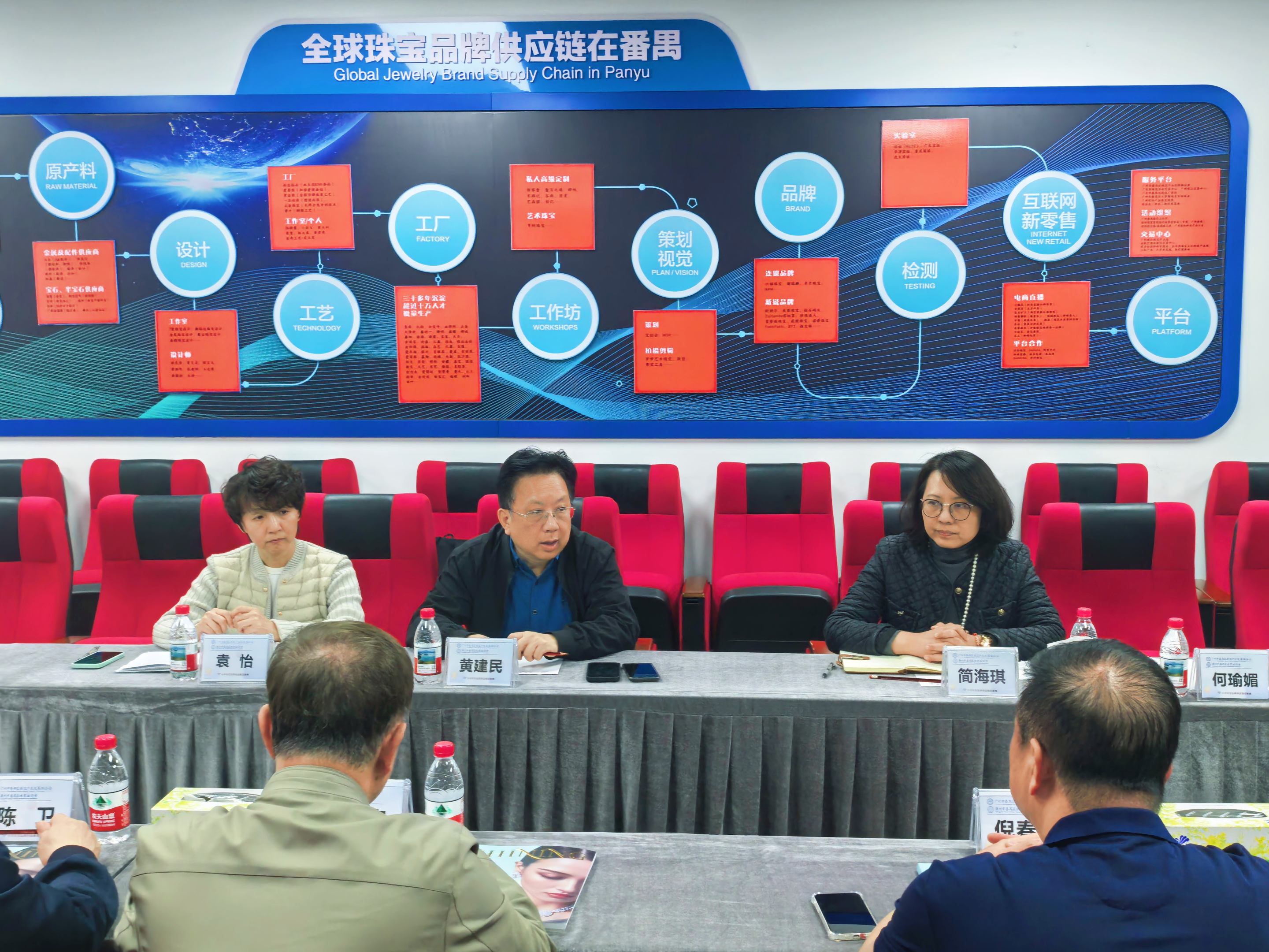 天津市黄金珠宝行业协会代表团由副会长兼秘书长李贵泉带队,成员包括副秘书长倪春光、副秘书长兼宝玉石文化分会秘书长陈卫,以及天津珠宝街有限公司总经理刘树霖、颐源珠宝经理王毅、君枫珠宝经理杨芳等企业代表。番禺区珠宝厂商会会长黄建民、秘书长简海琪及本地企业代表共同参与交流。