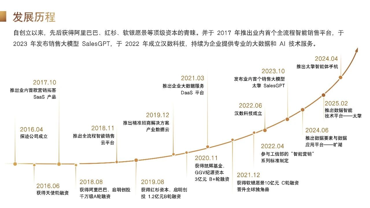 作为本次活动的合作单位,汉数太擎凭借过硬的技术实力备受行业认可。企业自创立以来,先后获得阿里巴巴、红杉、软银愿景等顶级资本投资,在数智化领域稳步深耕:2017年推出业内首个全流程智能销售平台,2022年成立汉数科技,持续为企业提供大数据与AI技术服务,2023年发布销售大模型SalesGPT,在智能销售领域树立行业标杆。