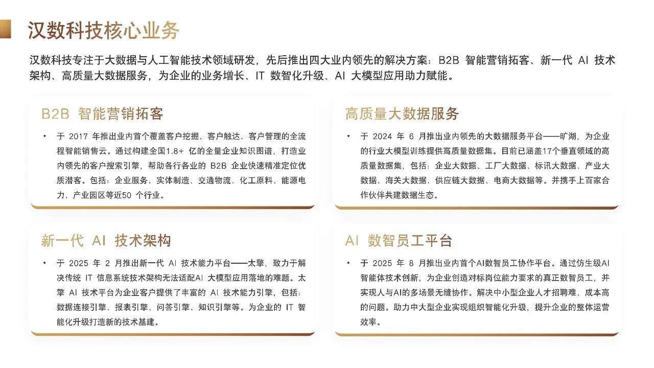汉数科技核心聚焦大数据与人工智能技术研发,依托深厚技术积累,推出B2B智能营销拓客、新一代AI技术架构、高质量大数据服务等四大行业领先解决方案,帮助企业精准触达客户、搭建智能技术底座、夯实数据基础,为企业业务增长、IT数智化升级与AI大模型落地应用持续赋能。