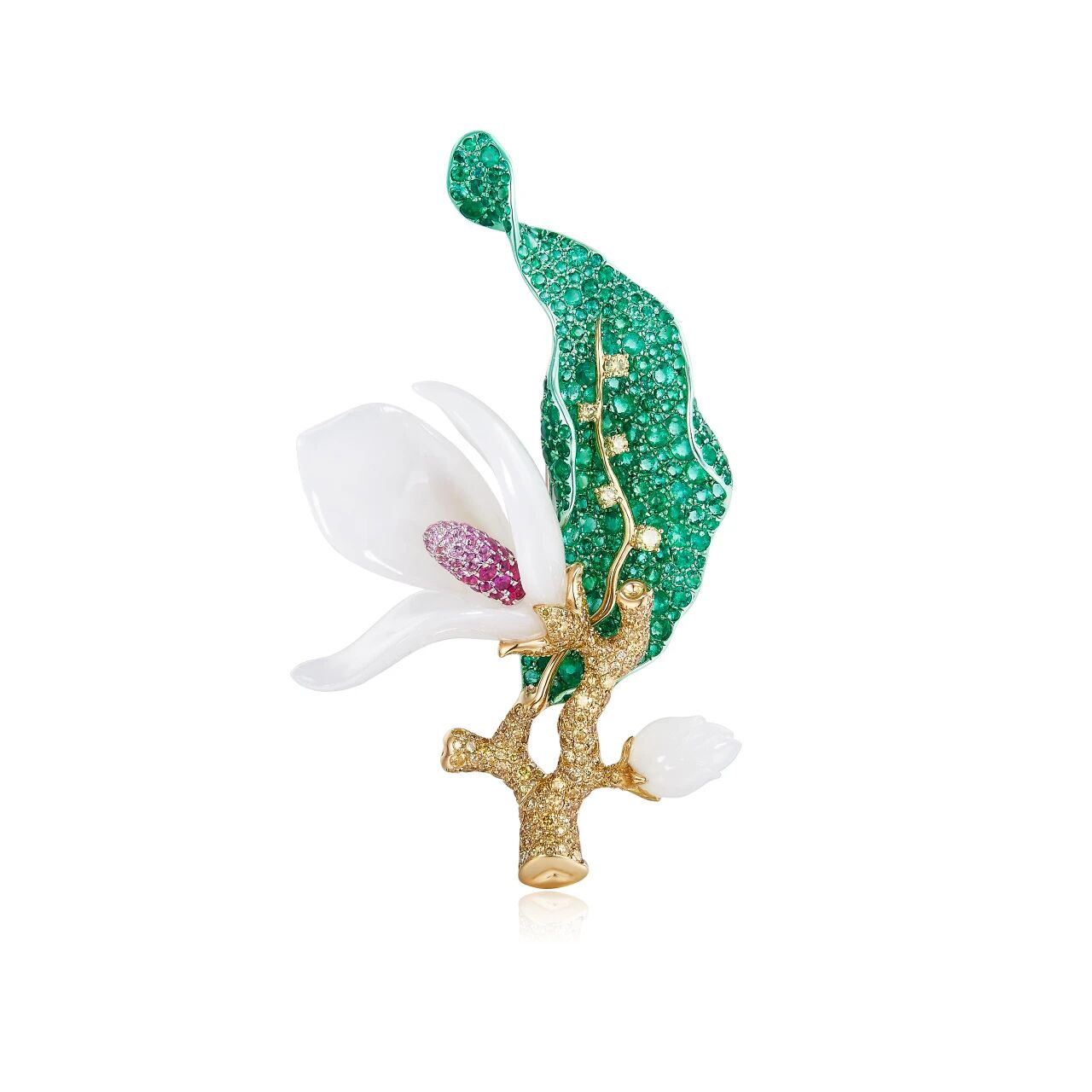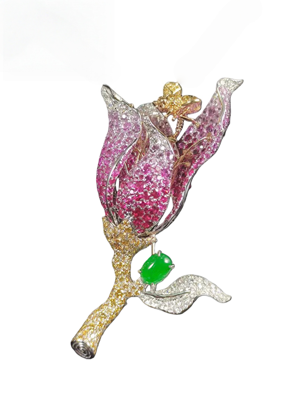 选自半开玉兰的造型,花瓣微张的质感与动态,以渐变彩宝、灵动蜜蜂与翡翠组合,提升了整件作品的视觉丰盈感和高级感,展现了玉兰花刚与柔的融洽。