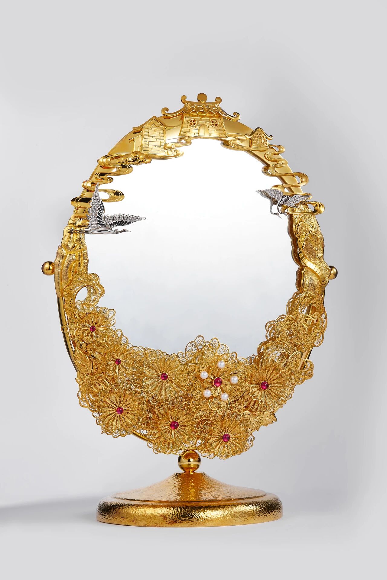 手工花丝镜以花丝工艺为核心,运用掐、填、攒、焊等传统花丝技法与挂、馊、捶等镶嵌技法嵌以珍珠宝石,镜身点缀姿态灵动、羽翼分明的仙鹤,将千年细金工艺之美与自然意趣相融。