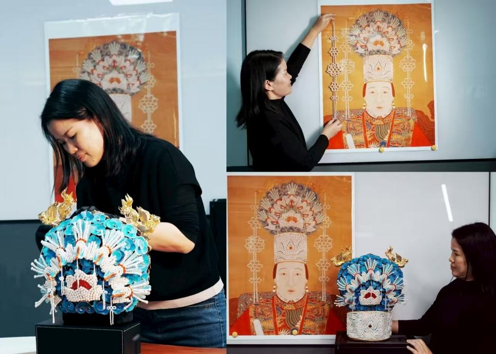 该冠饰以《临淮侯夫人史氏像》为蓝本复原,耗用6900余颗淡水珍珠,融合雕蜡、点翠、手工绣、钉珠等多项传统技法,历经近百天的潜心研究与精心制作而成。