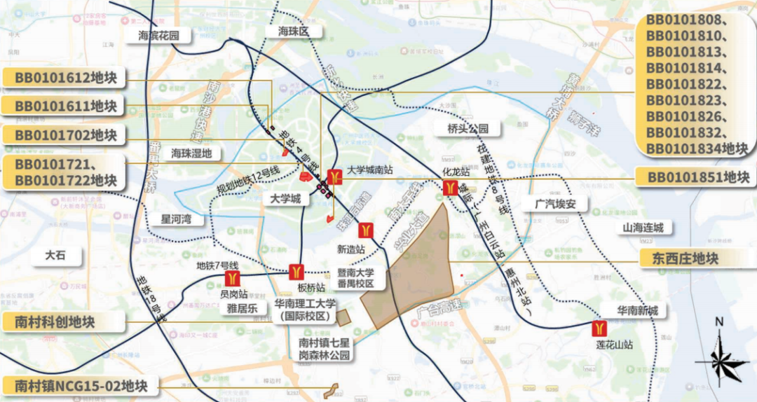 新中轴南段(番禺段)片区:番禺北地标性门户,南北衔接综合资源,坐拥2公里江岸、4条内涌与26公顷生态绿地,承载龙舟制造文化,可打造生态办公场景。